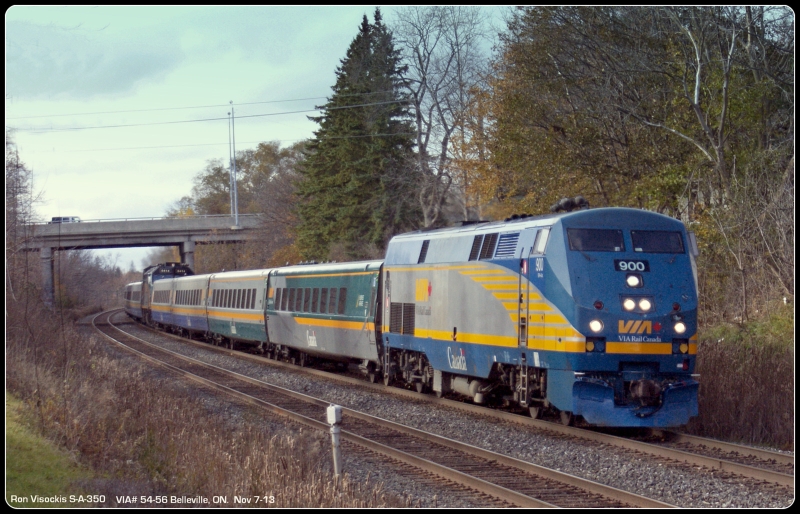 In the second, VIA P42DC 900+ is in charge of combined trains 54-56 at Belleville, ON Nov 7th. Note that the consist of VIA 54 includes one of the most recently released rebuilt LRC club cars, displaying the modified arrangement with the first side window behind the vestibule removed.