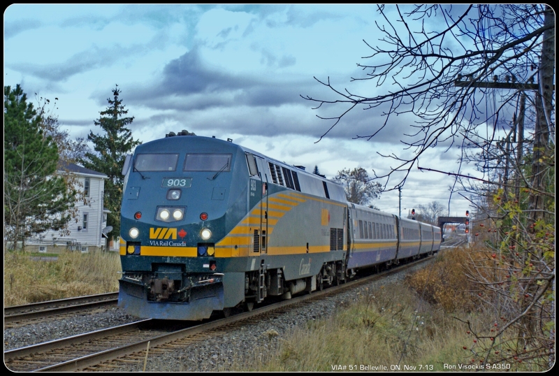Ron Visockis submitted these two photos: in the first, we see VIA P42DC 903 leading train #51 at Belleville, ON Nov 7th.