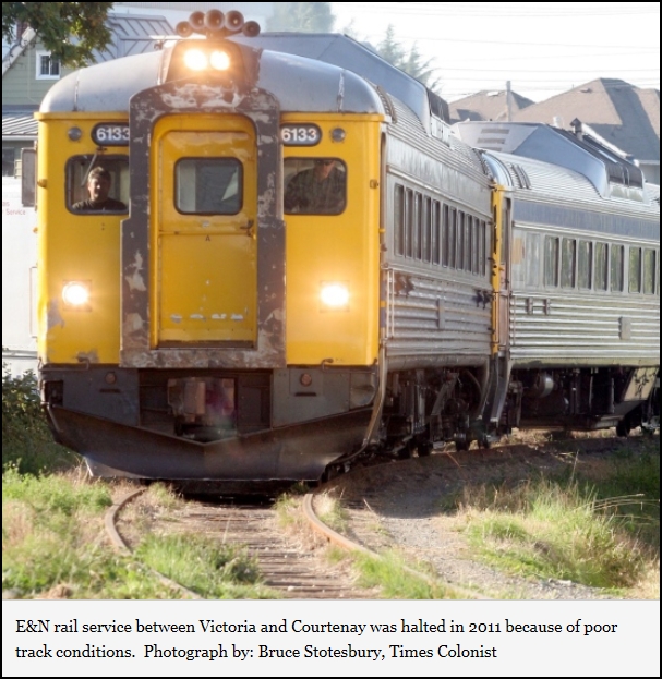 As negotiations to restore passenger service on the E&N rail line continue, bigger ideas are being floated. A tourist train serving the Nanaimo cruise ship terminal and an excursion train connecting Nanaimo, Ladysmith and Duncan are being discussed in preliminary talks between local governments and railway officials. At the Island Corridor Foundation, which owns the track, executive director Graham Bruce said he wants to focus on “tidying up arrangements” with Via Rail to repair the 298-kilometre line and resume passenger service between Victoria and Courtenay. Service was halted in 2011 because of poor track conditions. “There are a lot of different opportunities but nothing I can speak authoritatively to at the moment,” Bruce said. When asked if he has been in talks with Ladysmith Mayor Rob Hutchins about the excursion train — something mentioned in Ladysmith’s recently approved Sustainability Action Plan — Bruce said he didn’t want to give away too much, too soon. Hutchins said a Nanaimo-Ladysmith-Duncan train is being discussed but wouldn’t comment further. Bruce confirmed that a tourist train from the cruise-ship terminal in Nanaimo has also been talked about. Track repairs have been delayed because Via and the Island Corridor Foundation have yet to agree on what sort of service should run on the tracks, and how it will be financed. Freight service on the rail line continues at reduced speeds.