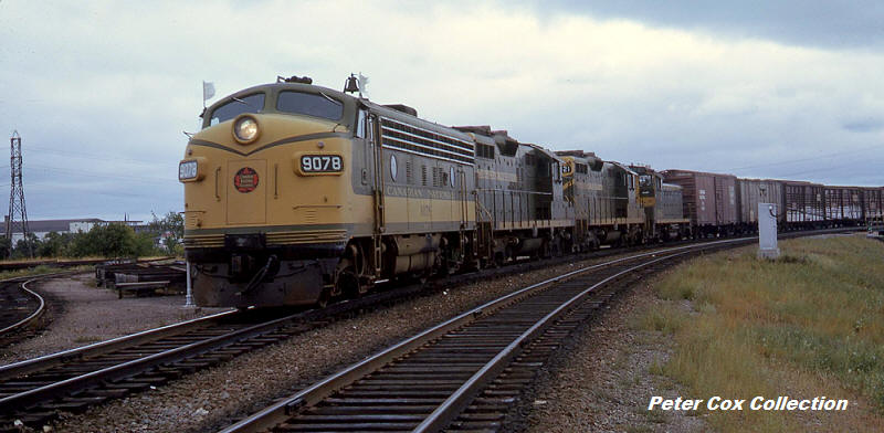 CN No. 64 with GP9 4147 at Winnipeg MB September 12, 1063.  Peter Cox points out this geep had an odd exterior duct. As well, CN 6517 was the only CN cab unit I ever saw with the exterior spark cans.  I believe all the other FP units and certainly all of the F models, had the Farr-Air type which was installed right above the 567 engine and below the roof, so nothing showed outside.  Quite a few Geeps were built with the Farr-Air system, so if you have pix of CN Geeps with no rooftop cans, that is why.  As you know, many Geeps got rebuilt into the 4000 and 7000 series, for other uses.  I have to think that some of those had interior spark arrestors, so if you find one with no cans, take a look inside to see what the Farr-Air arrangement looks like.