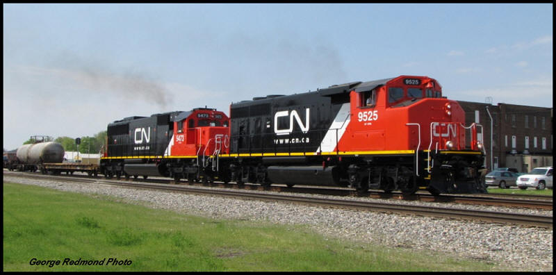 Both less than a week out of the paint shop, CN GP40-2LW 9525 and CN SD60  5473 lead NB train L591 out of  Centralia, IL May 2nd  George Redmond was first to bag CN 5473 in new paint.