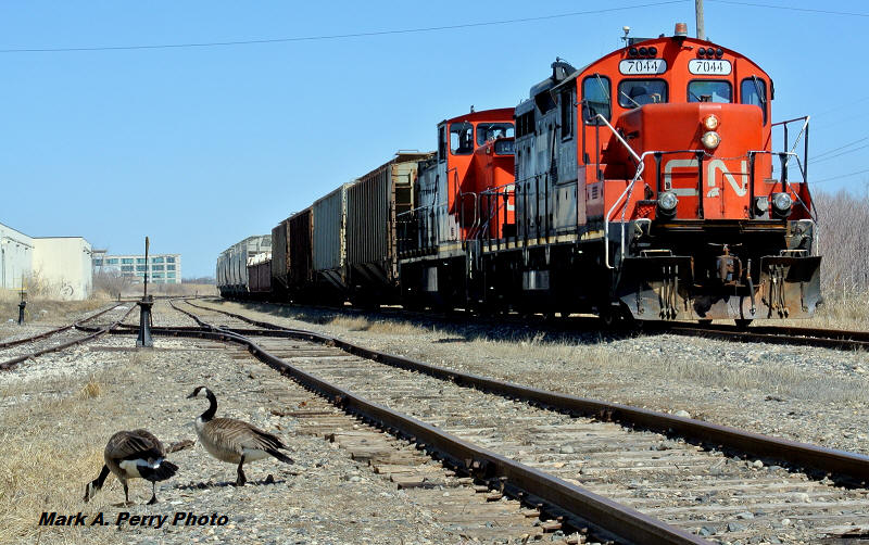 CN GP9RM 7044 and CN GMDiMu 1401 switching in Ft. Whyte Industrial Park in Winnipeg, MB May 6th.