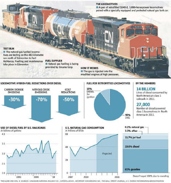 Assigned on train between Edmonton and Fort McMurray, Alberta CN continues to test two 3,000-horsepower locomotives retrofitted with engines that run on a fuel mix of 90-per-cent liquefied natural gas and 10-per-cent diesel. The route to the oil sands was chosen partly because of the difficult, rolling terrain and the high-tonnage trains locomotives typically pull on that route.  For rail companies such as CN, the benefits of natural gas engines include reduced greenhouse gas emissions and operating efficiency. According to Energy Conversions Inc., the Tacoma, Wash., company that supplies the inner working of CN’s converted engines, the natural gas engines release 30 per cent less carbon dioxide and 70 per cent lower nitrogen oxide compared with conventional diesel-burning locomotives.