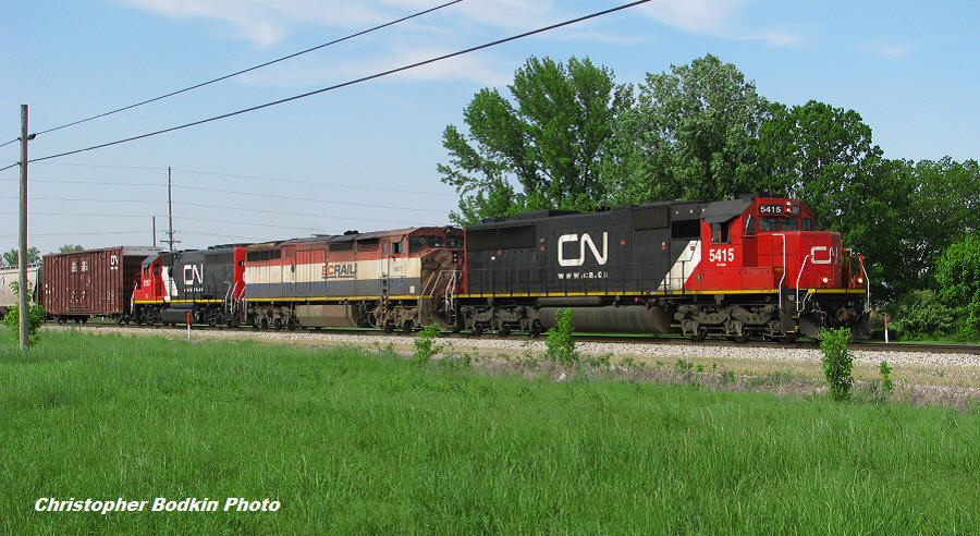 CN SD60 5415, BCOL C40-8M 4607, and IC GP40R 3117 are stopped with A432 north of Carbondale, IL on May 15th. A brake hose hanger on a car 79 cars back had broken, putting the train in emergency. A quick repair by the crew to put the hose back in place and the train was underway again, but delayed Amtrak #392 by 35 minutes.