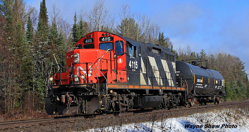 At old Muskoka Road on April 25th, snow and freezing rain had coated the trees with a thick layer of white overnight, so I thought I'd head out and capture 595 in one last wintery shot for six months or so. By the time the train with CN GP9RM 4115 had approached this spot just north of Mile 138 on the Newmarket Sub the sun had burned off most of the fog and the frosting had all but melted off.