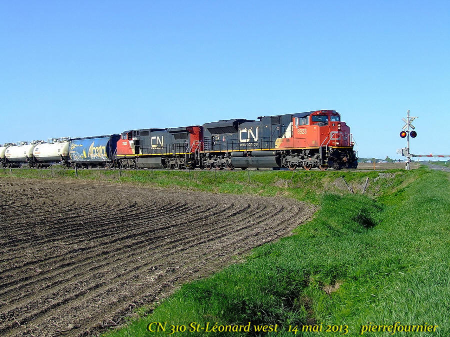 Passing through St-Léonard, QC  westbound May 14th, was a very long CN 310 assisted by mid-train DPU CN 2535 hauling Train 786’s  tank cars, three brand new auto racks for the TTUX,  grain cars, box cars and 20 new mini gon’s waybilled to the QNS&L dragged on the tail end.