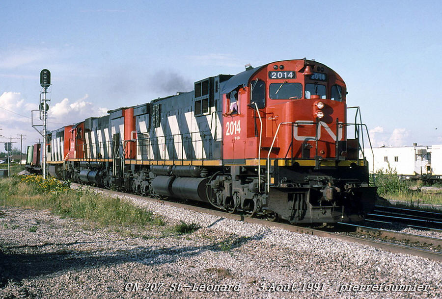 Over 20 years earlier near the same St-Léonard, QC location,  Pierre Fournier photographed train 207 (Halifax intermodal), led by immaculate CN M630 2014 on August 3rd 1991.