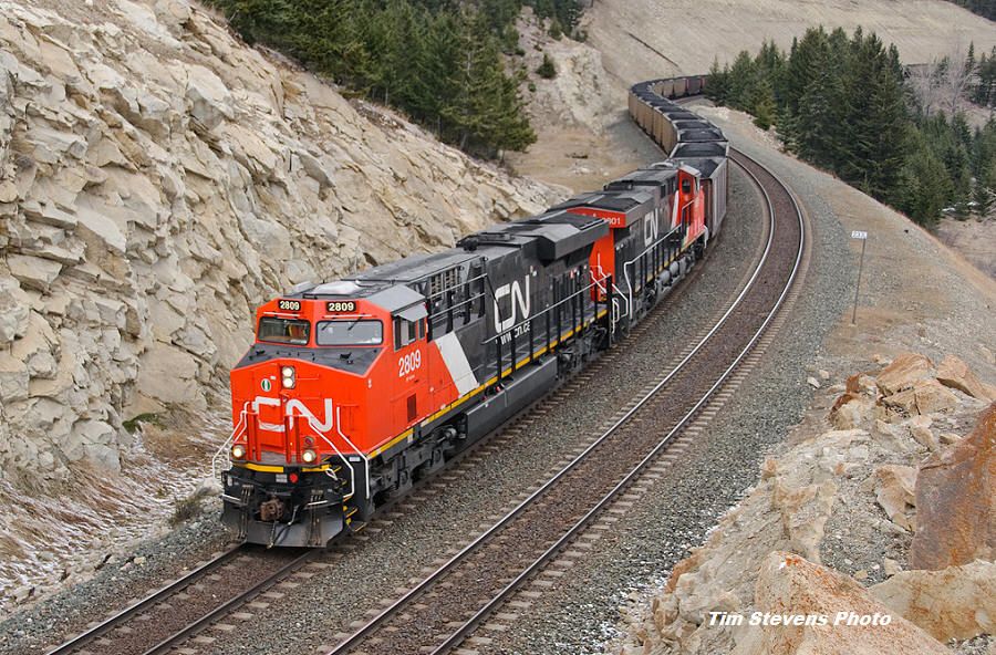 At Mile 233.0 on the Edson Sub, Tim Stevens photographed CN ES44AC 2909 and 2801 grinding their way to Jasper, ON with a heavy coal train, April 5th.