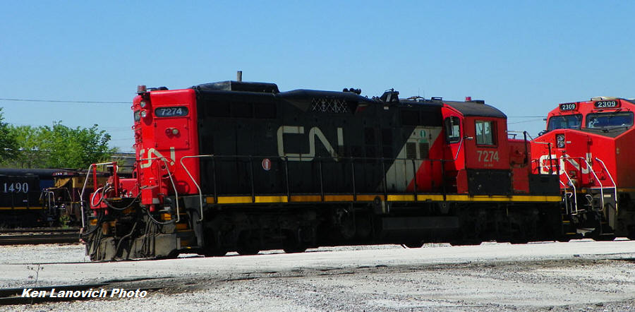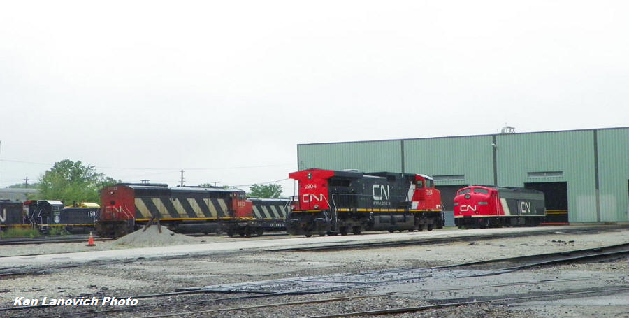 While CREX 9023-9064 are on the property, none of the 42 C40-8s (4000 hp) have entered service, at this time only renumbered CN 2000-2041 in spray paint.  These are ex-UP same numbers, nee-CNW 8501-8542, and the second group of ex-UP, nee-CNW Dash 8’s that CN has purchased.  These are to be painted at Centralia and then completed at either Metro East Industries (MEI) in East St. Louis, IL. or at Quality Rail in Madison, IL.  These CREX C40-8’s were constructed at GE - Erie, PA  in 1989, as CNW 8501-8530, and as CNW 8531-8542 during 1990.  When Union Pacific  acquired the Chicago & North Western Railroad  they got numbered UP 9023-9064, but not in sequence.  When retired by UP during 2008 and 2009, they were sold to Citicorp Railmark and retained their UP livery and road number, with CREX on the cab sides.  Prior to being purchased by CN last year, these had been leased to CSX.
