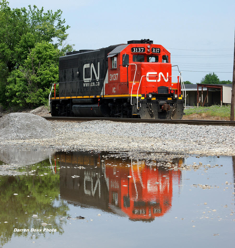 Darren Doss snapped repainted IC GP40R 3137  reflecting in a pool following a rain storm in Dyersburg, TN.