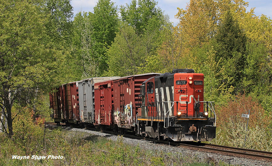 Spring has returned to the Muskoka Region of Ontario, and along with it so has CN GP9RM 4132, after a rather lengthy absence. Here it is approaching the Bethune Road crossing near Mile 143 of the Newmarket Sub, on its return from Martins after switching the Panolam plant on May 13th.