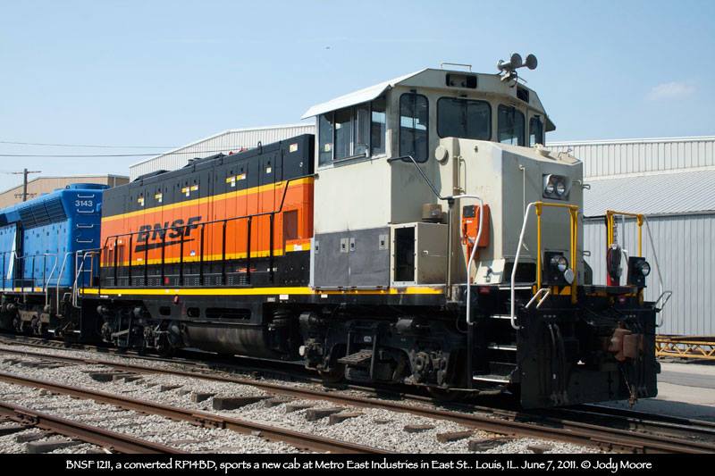 Former GG20B BNSF 1211 had a cab added to it at MEI in East St. Louis, IL on its way to becoming Railpower RP14BD leaser RPRX 1411. This unit had previously been cabless, and was converted to an RP14BD genset by Railpower following the sidelining of the GG20B fleet. BNSF 1211 suffered a fire in early 2007 that helped herald the end of the hybrid era. (Jody Moore CRO GREEN NEWS)