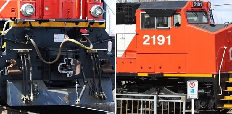 On March 21st, CN train 369 experienced an undesired brake application as it was approaching Bath Ontario (between Kingston and Belleville). On examination the Conductor found the train divided immediately behind the DPU (CN ES44AC 3037) because the coupler head had broken off the drawbar. The cause of the brake application was a disconnected hose between the first and second cars behind the DPU. One of our CRO readers Malcolm Peakman was at Napanee Station when the train passed and managed to get the attached picture of the failed coupler. The train also had recently repaired CN 2191 in the head end power, I noted that the cab has no class information indicated.