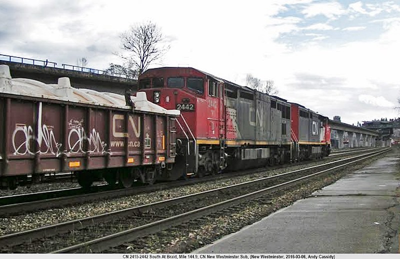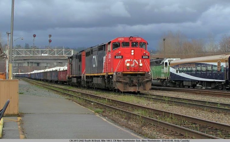 On March 6th, 2016 Andy Cassidy was at the BNSF Terminal in New Westminster, BC shooting the two Rocky Mountaineer coaches sitting in the BNSF Old Yard on track 10 at the terminal, Mile 145 on the CN New Westminster Sub. The question on what was happening with the coaches was answered by Ian Smith of the CRHA Pacific Coast Division, as follows, "The Rocky Mountaineer cars are on their way to California for conversion to Silver Leaf specifications. The work is being done by Alstom at its factory on Mare Island in Vallejo, formerly a military facility." So thanks Ian and back to this set then. As luck would have it, a CN train that had been waiting over at Brunette (due to a previous Northbound movement when I first got there), started heading South to the Fraser RiverBridge. So I was able to get a handful of shots of him, plus a few of the cars in tow. CN 2415-2442 (GE Dash 8-40CM's) were doing yeoman's work here.