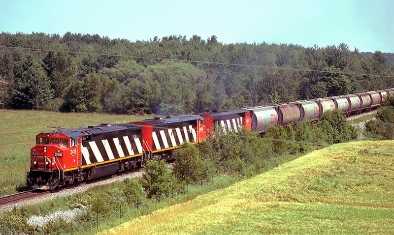 Near St-Leonard, QC atop the Route 191 Viaduct on July 29th, 1990, Pierre Fournier clicked CN 307 with 3 new GE C40-8M's rolling along the Drummondville Sub. He recalls how the engine men enjoyed operating and riding in them.