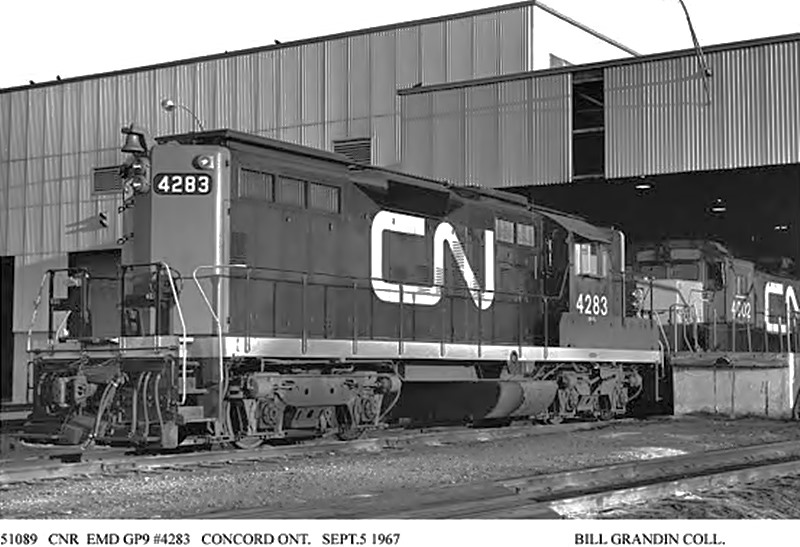 On September 5th, 1967, CN GP9 4283 shows of her new Noodle paint scheme at the Toronto Diesel Shop.