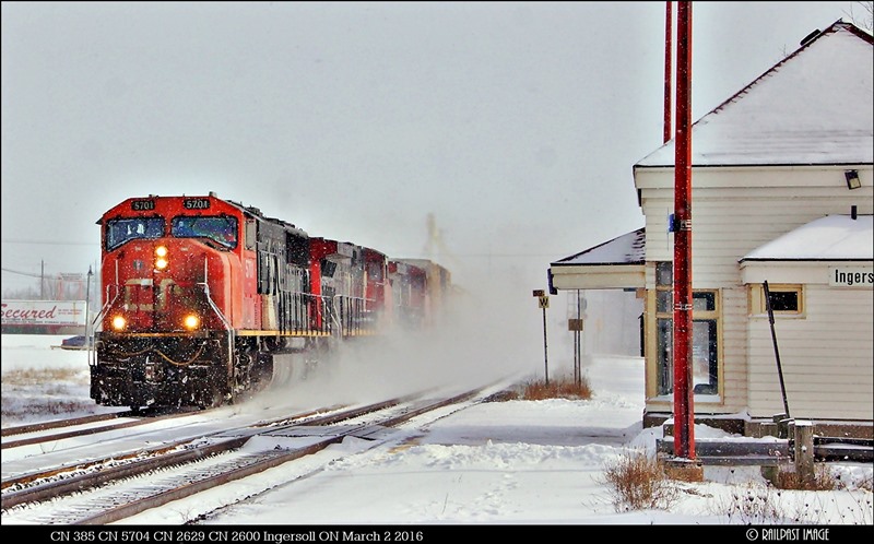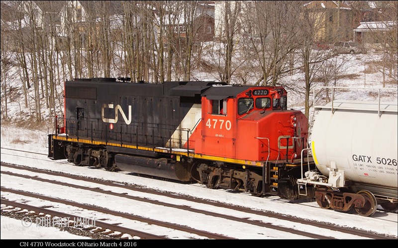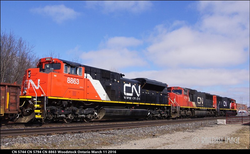 CN SD75I's are well liked by CN crews that we have spoken with. On March 11th, Walter Pfefferle snapped four GMD SD75I's which headed up two trains that met in Woodstock, Ontario. CN 5744 CN 5794 and CN 8863 were first on an eastbound and then were met by CN 5774 and CN 5757 on a westbound at the Woodstock VIA Station.