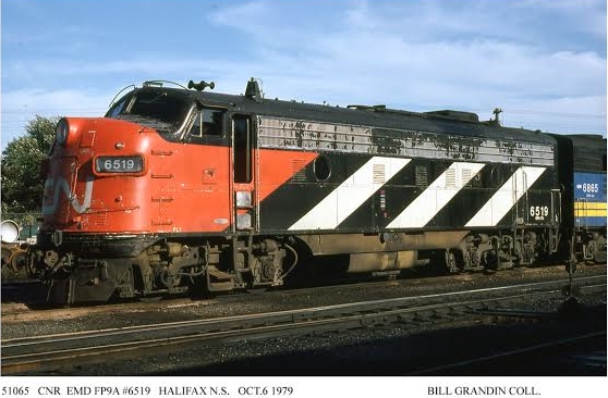 CN FP9A 6519 has a VIA painted B-unit behind as they wait their next passenger train assignment in Halifax, NS on October 6th, 1979. |