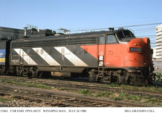 On July 26th, 1980, CN FP9A 6535 cools her heals in Winnipeg, Manitoba as she waits her next passenger train assignment. |