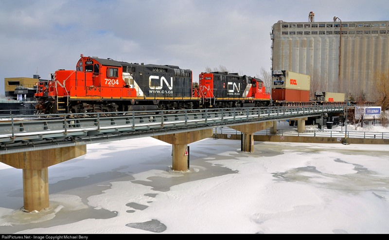 CN Survivors! On March 2nd, Michael Berry clicked CN train 500 with double GP9's and double stacks on the wharf at the Port of Montreal. The CN transfer has GP9RM's (CN 7204 and CN 7246, both very clean and in the current CN paint scheme), with a long string of well cars, with double stacks, single stacks and some empties. The train is crossing over the eastern end of the Lachine canal and passing the eastern edge of grain elevator #5 .