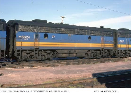 VIA F9B 6624 is at Winnipeg, Manitoba on June 24th, 1982. |