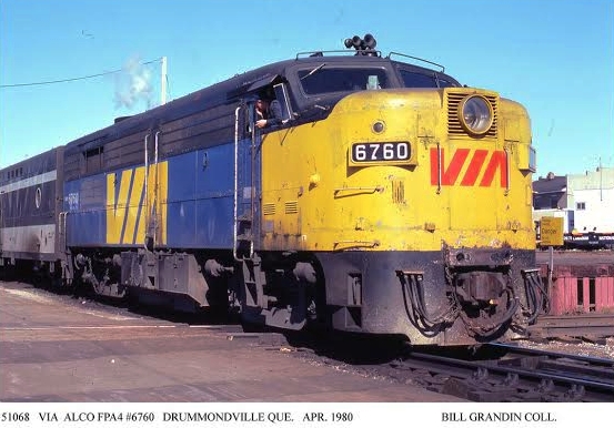 In April 1980, VIA FPA4 6760 has an (SGU) Steam Generator Unit behind for extra heat at St-Leonard, QC, as the engineer looks back from the cab to the conductor on the Station platform. |