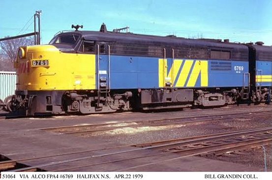 At Halifax, Nova Scotia on April 22nd, 1979, VIA FPA4 6769 with assistance from an F9B, is ready to take the Ocean back to Montreal, QC. |