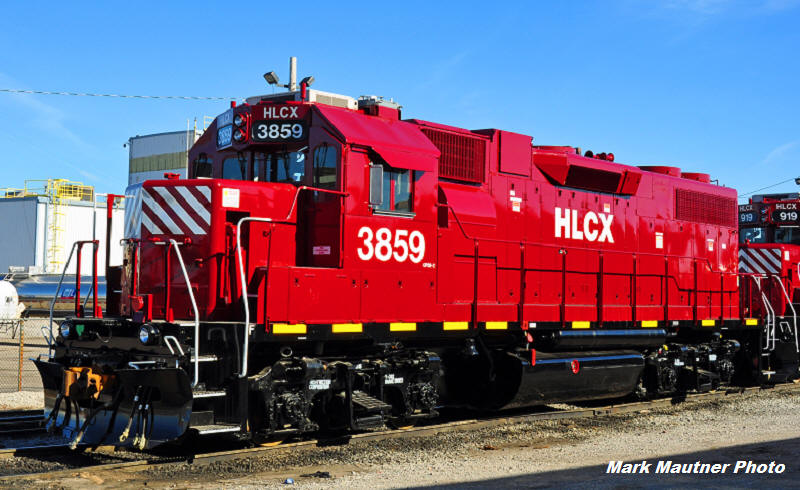 Wearing fresh HELM paint, HLCX GP38-2 3859 (ex-L&N) sits in the sun outside the MEI Shop, with HLCX SD40-2 919 behind.