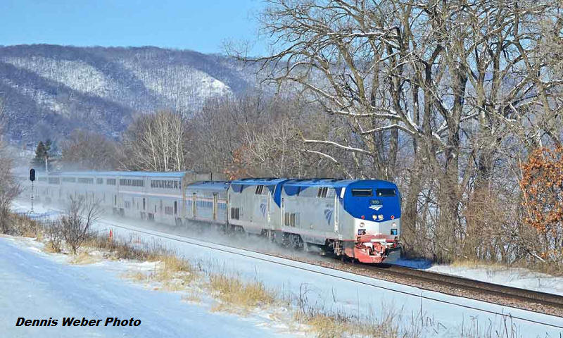 On February 2nd, Dennis Weber snapped Amtrak train #8 the Empire Builder led by AMTK 100 and 44 shown blowing up the light snow at Donehower, MN.