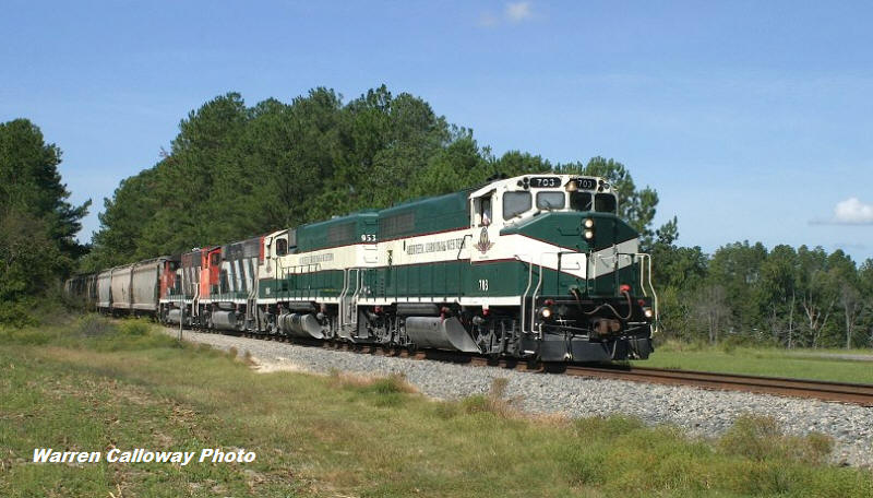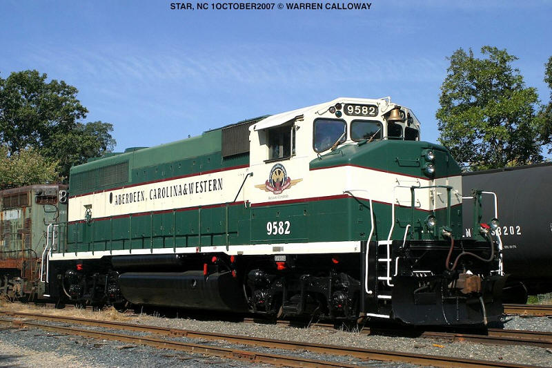 Warren Calloway snapped these Aberdeen Carolina & Western railroad units located at Star, NC), a shortline that loves Canadian locomotives. ACWR GP40-2W 703 near Seven Oaks, NC, and ACWR GP40-2LW 9582 at Star, NC on October 1st 2007. The ACWR has a total of 15 former Canadian units which are GP40-2W 703 (nee-GO TRANSIT 703),ACWR SD40-3 6907, 6909, 6910. 6918, 6919, 6922, 6925, and 6926 (all ex-CN SD40), ACWR GP40-2LW 9529, 9538, 9556, 9582, 9593, and 9624, (all ex-CN same numbers).