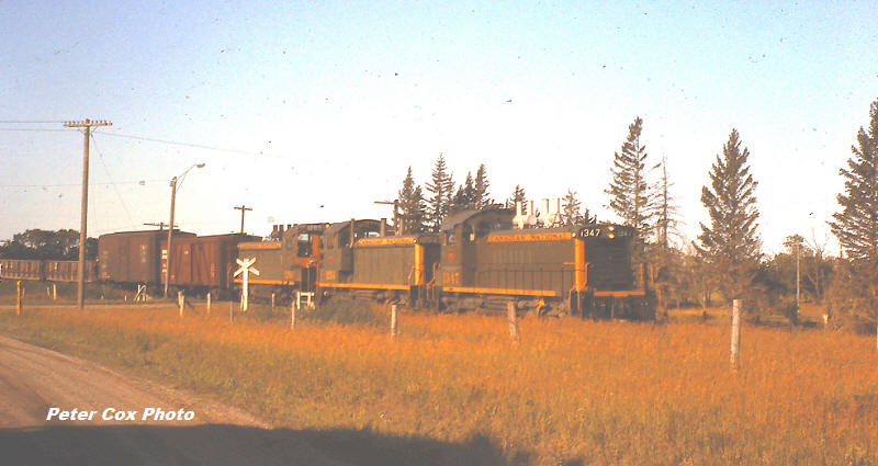 A trio of CN SW1200RS’s move a local freight on a typical prairie secondary mainline trackage at Yorkton, SK on August 8th 1957. The lead unit (CN 1347) has the as-built frame-mounted horizontal handrails while the two trailers were built earlier, with hood-mounted handholds - a legacy from their yard service ancestry.